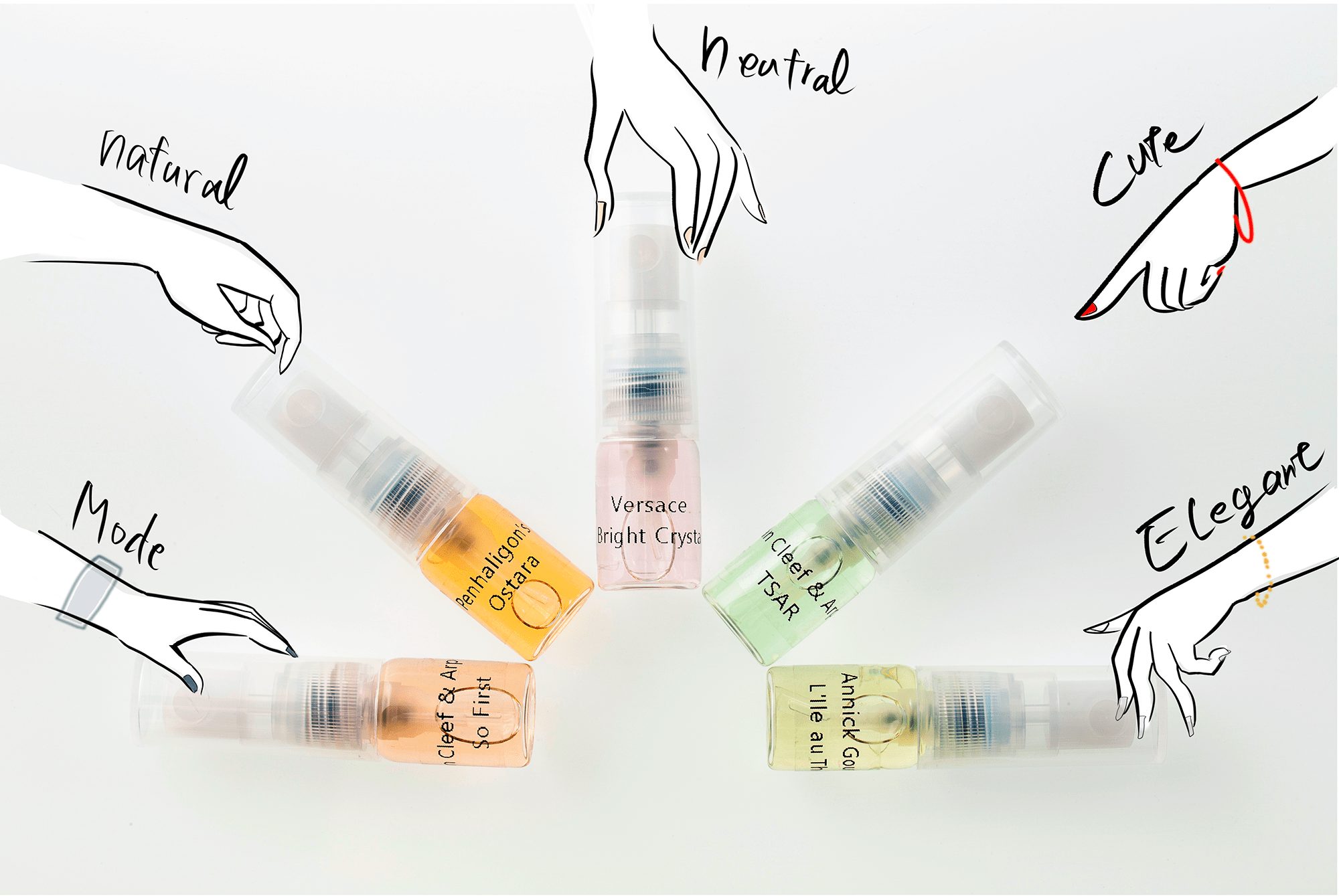 求める香りを伝え、日本フレグランス協会の資格持ったプロのスタイリストが、お試しサイズの香水を「5つ」提案。