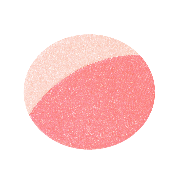 ①色の濃いチークカラーを頬の高い位置へ楕円形にぼかす。