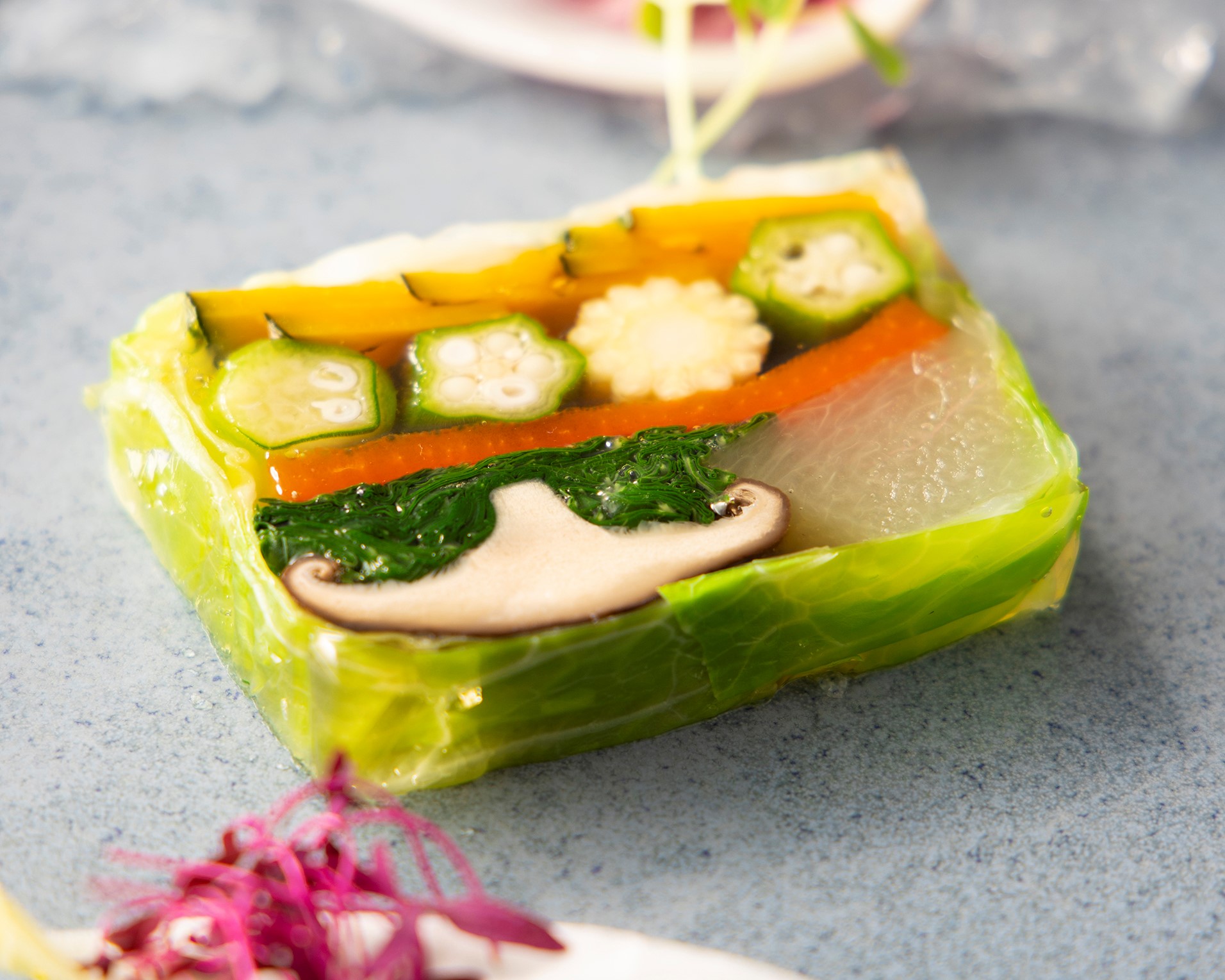 旬野菜本来の自然な美味しさを活かして、こだわりの黄金出汁に、少しの天然塩だけで仕上げられたテリーヌ。