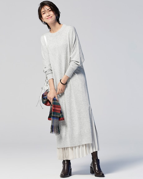 ワンピース自体はゆるっとしたシルエットですが、レザーブーツと合わせたりアクセサリーなどのアイテムでメリハリをつけてあげると、だらだらした印象ではなく大人の落ち着いたコーディネートになります。