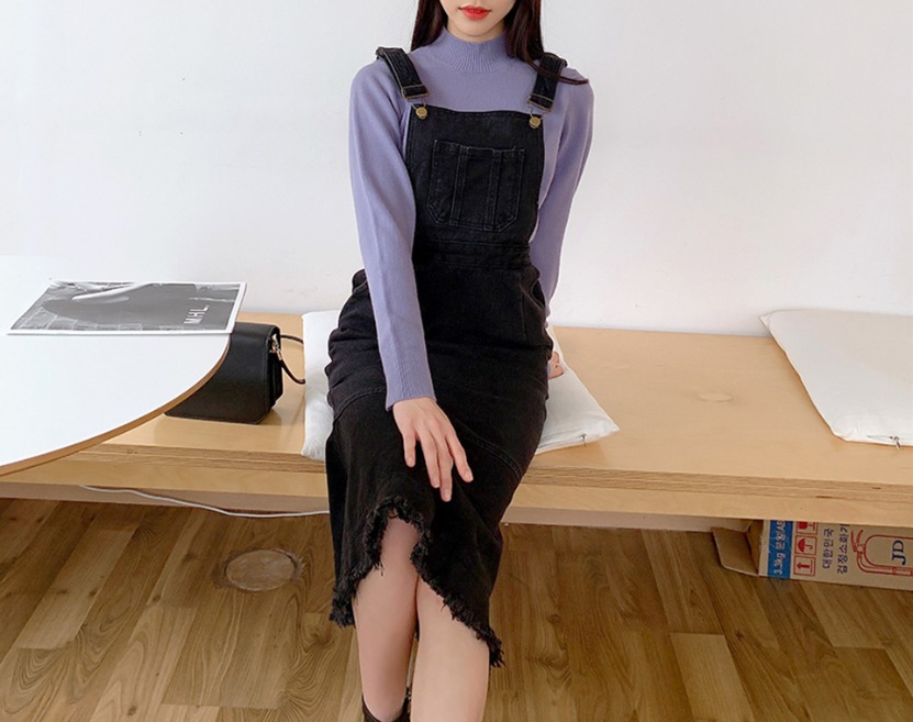 デニムワンピースを選ぶ際は、ミニ丈ではなくマキシ丈。首元があいているインナーではなくハイネックを。