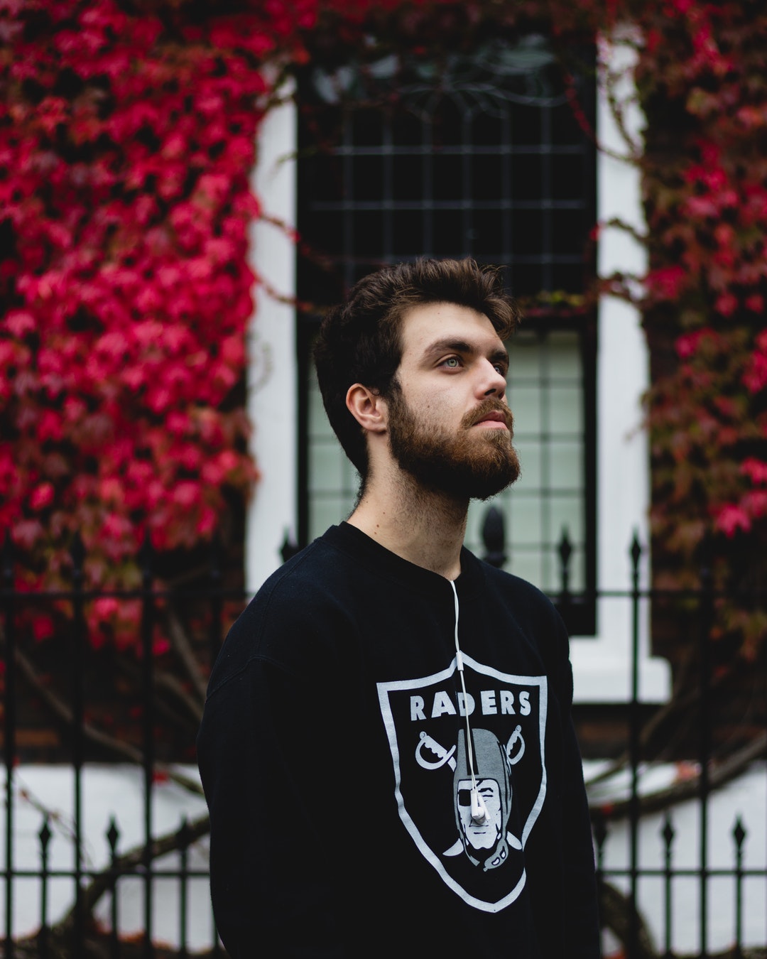 こちらのメンズのコーディネートでは、マウンテンパーカーだけでなくボトムスにもくすみ感のある色を取り入れています。しかし、くすみカラーばかりを合わせてしまうとメリハリのない着こなしとなってしまいますので、トップスに柄のアイテムを合わせるようにしましょう。これだけでもコーデの印象が大きく変わります。