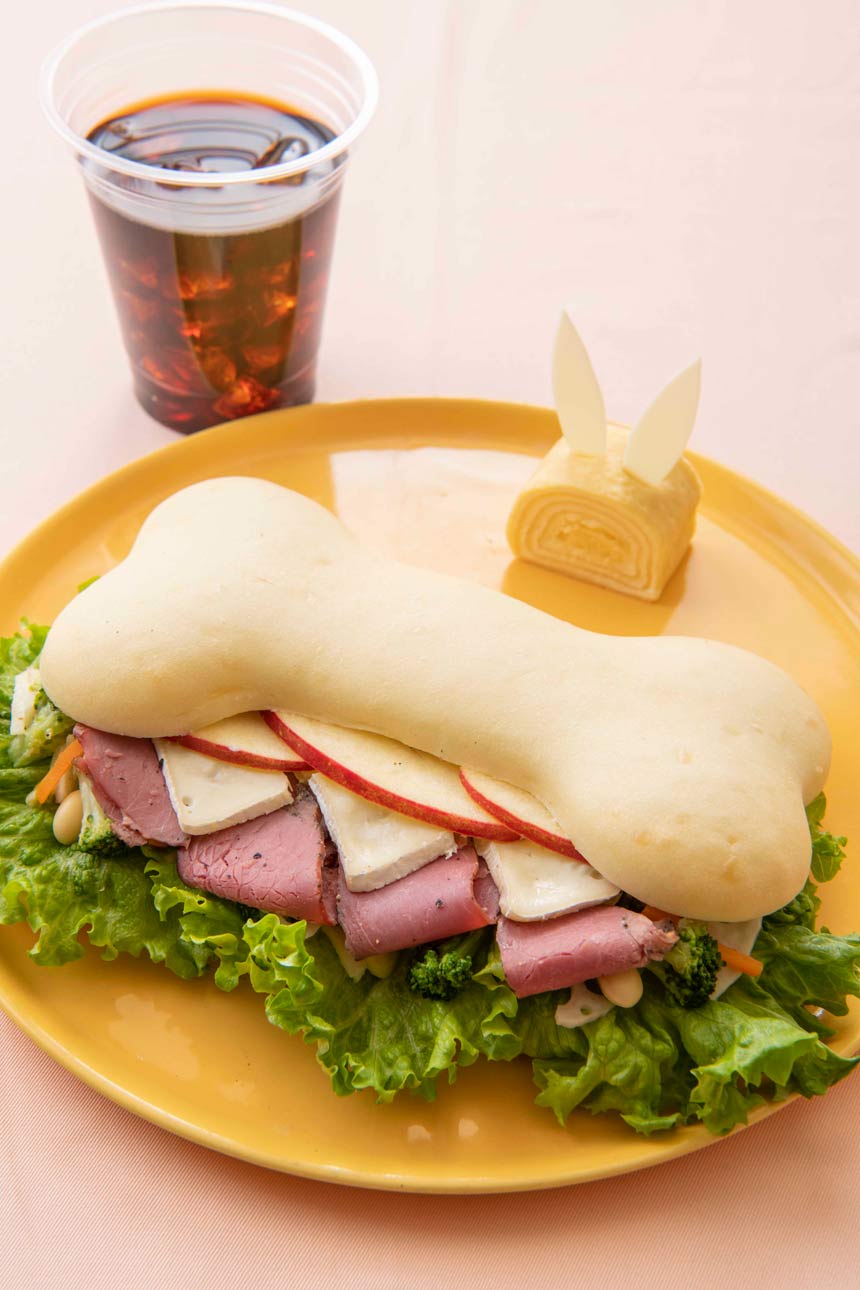 プルートの好きな骨を思わせるサンドウィッチは、わさび香るパストラミビーフとカマンベールチーズが入っています。ミルクレープロールケーキとソフトドリンクが付いて、¥1,600です。