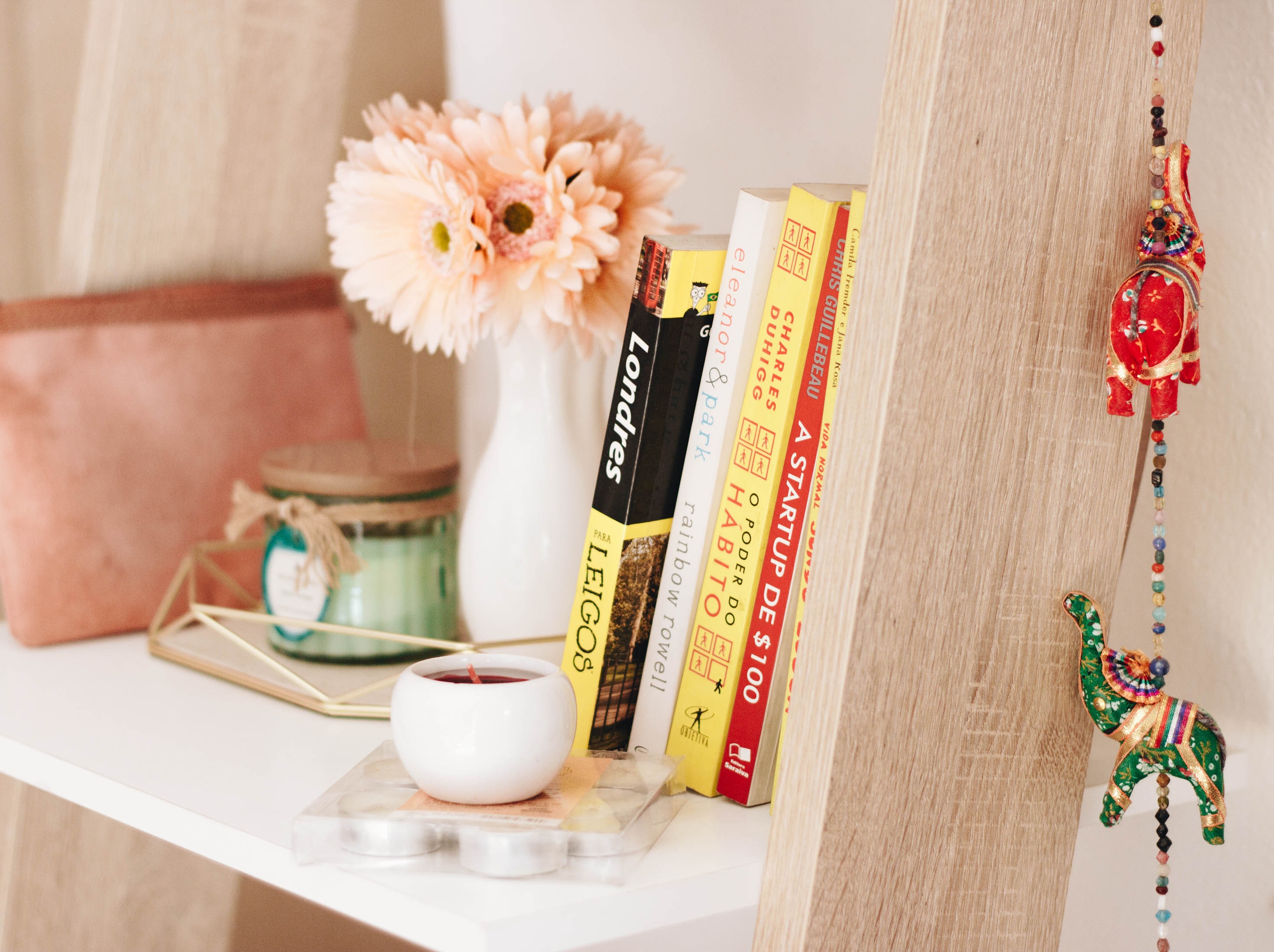 小物の収納にペーパーボックスが便利。こちらはキャンドゥの「ペーパーボックス ブック型」で、本そっくりの形の箱へ収納できます。