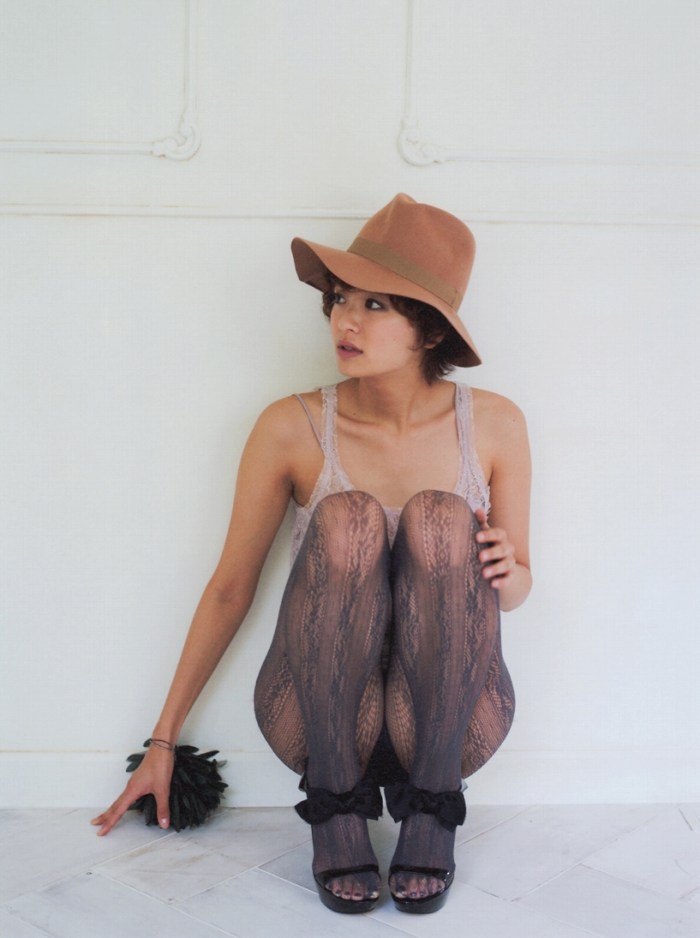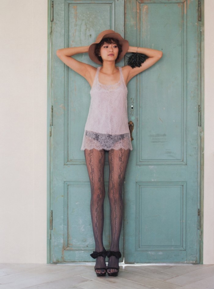 ブラックのパンティに透け感のある白のレースキャミソール、そしてレースのストッキングで甘さのあるセクシーな女性に大変身した榮倉奈々さんです。