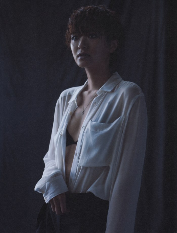 ホワイトのボタンダウンシャツから黒のブラをチラ見せしている榮倉奈々さんの写真です。濡れたような髪の毛がさらに色気を引き出しています。