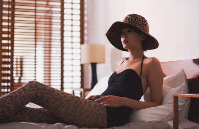 黒のセクシーなキャミソールにレパード柄のタイツをはいているだけのかっこいい榮倉奈々さんの写真です。レパード柄のワイドブリムハットと合わせてまるでハリウッド女優のよう。