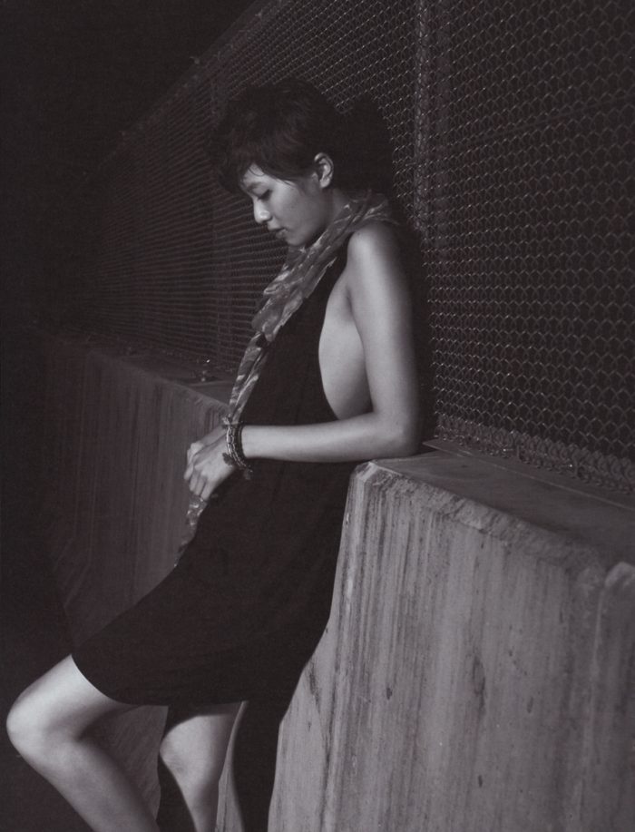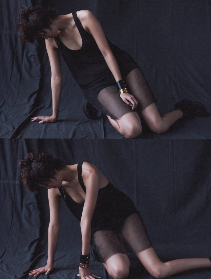 黒のベアトップキャミソールがセクシーな榮倉奈々さん。肩紐が細く華奢デザインがとてもフェミニンです。