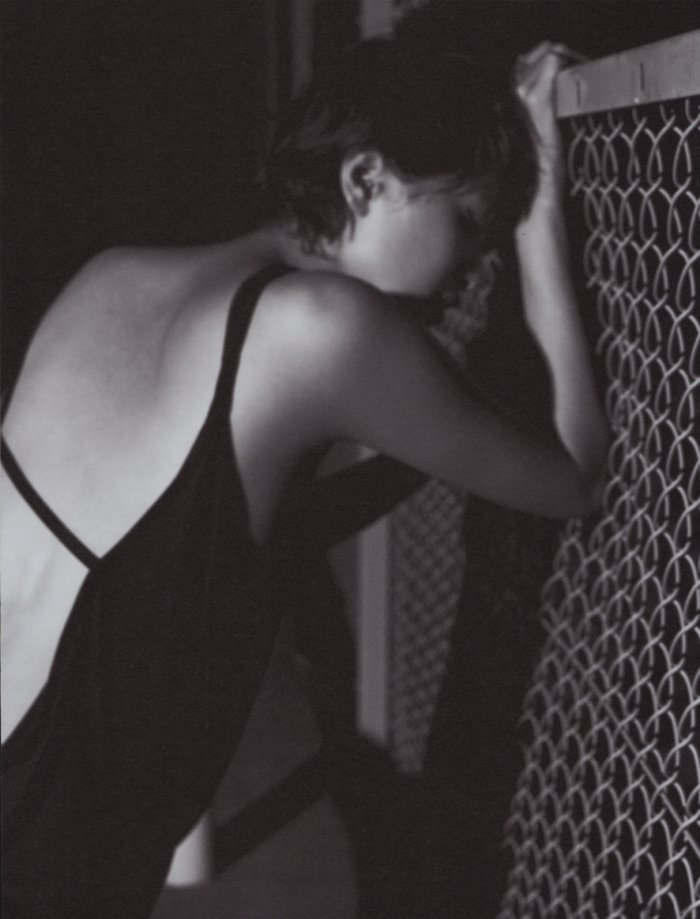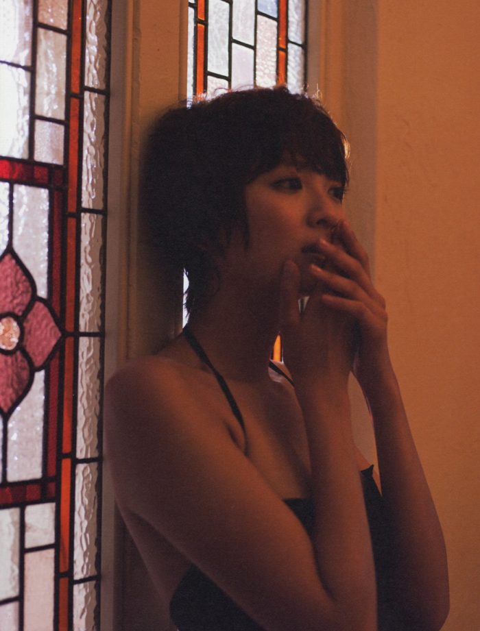 鏡の前で肘をついてまるでメイクをなおしているような榮倉奈々さんの写真です。スっとのびる脚、キュっとあがったヒップ、セクシーな衣装、映画キャバレーに出てくる女優さんのようですね。