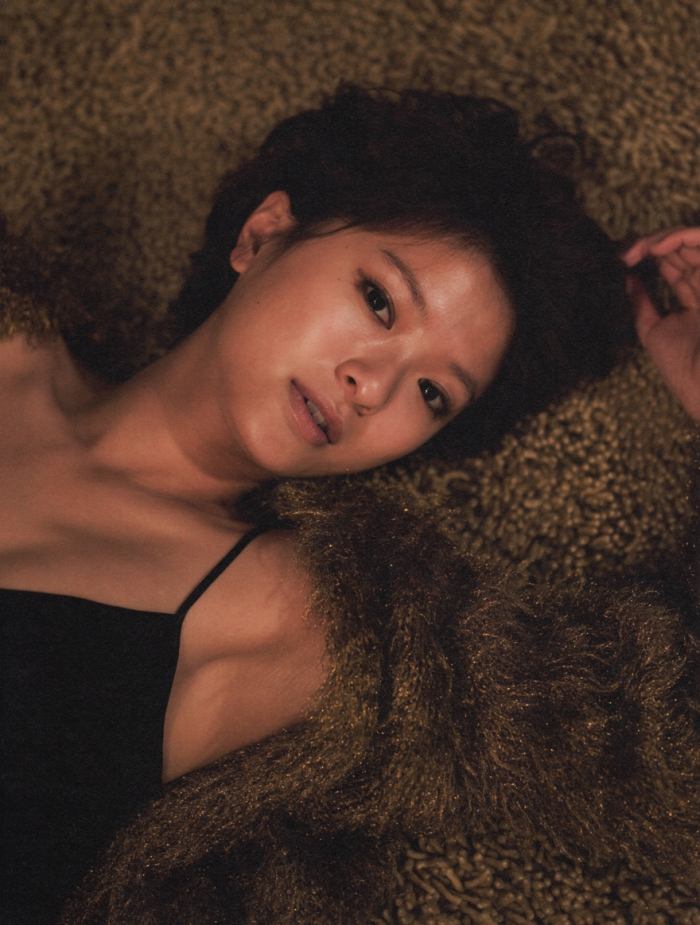 ブラックキャミソールの上にファーのジャケットをはおり横たわっている榮倉奈々さんの写真ですが、表情がなんともセクシー!誘うような目にドキドキしてしまいます。