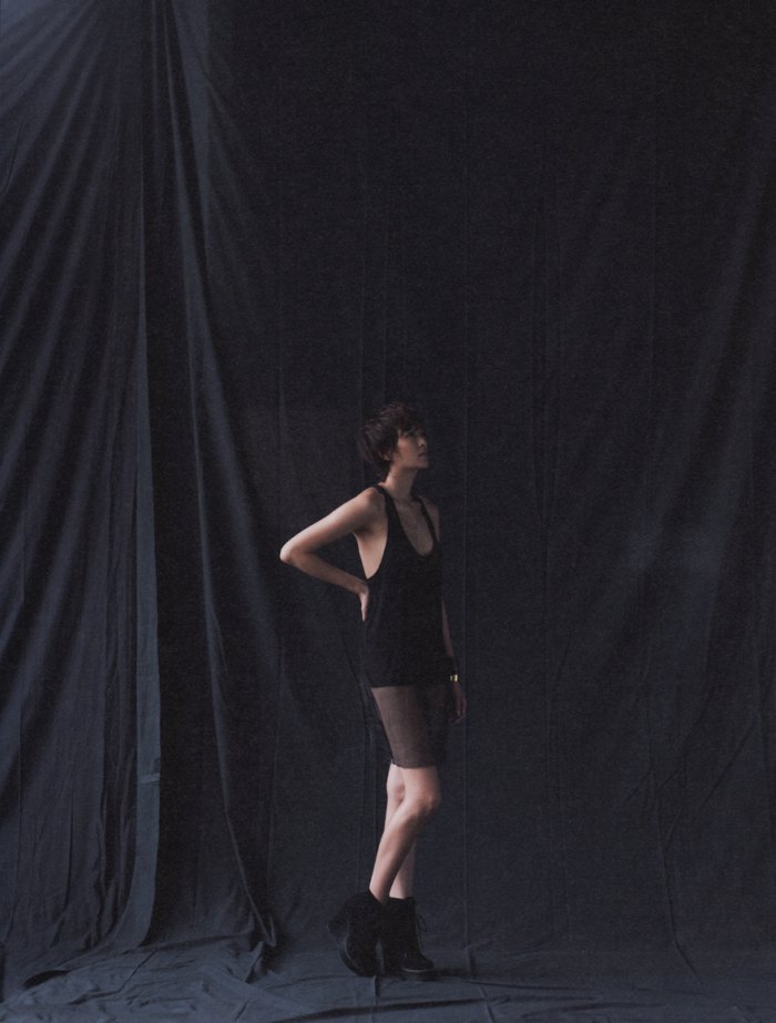 ノーブラでタンクトップドレスを着た榮倉奈々さんのセクシー写真です。お尻から下がブラックのシースルーになっていて大きくあいた胸元からのぞく谷間にドキリとしてしまいます。