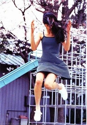 ジャングルジムからジャンプして飛び降りるところ。細身のワンピースがすごくよく似合っています。