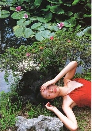 赤のワンピースで仰向けになる子供時代の栗山千明さん。思わず胸元に注目してしまいますね。