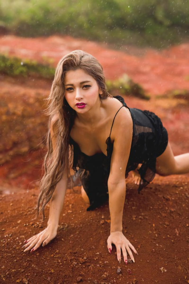 黒のセクシーなワンピースはカット部分が大きくて上エストのくびれが強調されています。