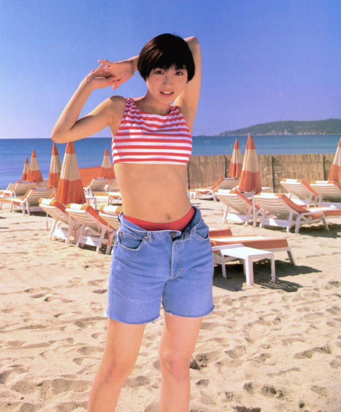 赤と白のストライプデザインの水着姿。未成熟なボディがまだ少女のあどけなさを感じさせます。