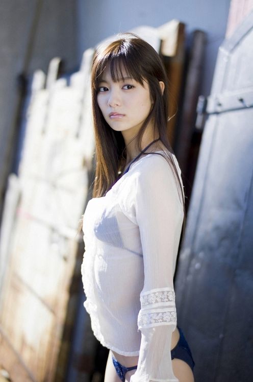 服の隙間から水着をチラ見せして誘っているかのようなワンショット。美人ですね!
