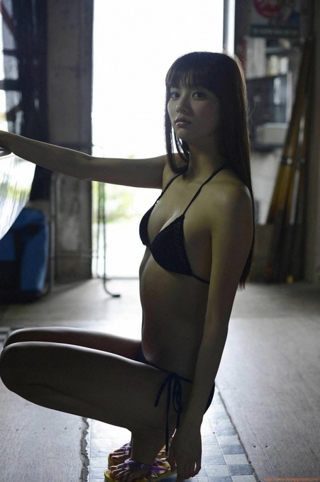 黒の水着でセクシーポーズを取る新川優愛さん。若い肌がみずみずしくてとっても素敵です。