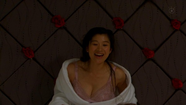 下着の上に白いバスローブを羽織った姿。ノーメイクに乱れ髪がセクシーですね!
