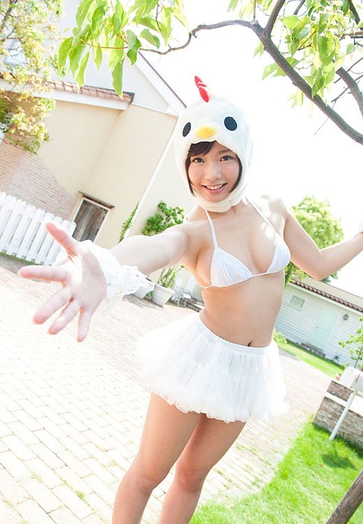 ニワトリのかぶり物をしてちょっとユニークなコスプレ姿を披露している紗倉まなさん。ノリが良くてすごく可愛いです!