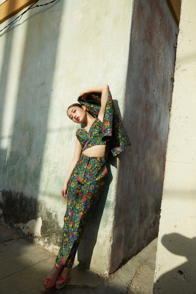 個性的な花柄デザインのセットアップコーデですが、石原さとみさんが着るとオシャレに見えます。キレイな胸元が光にあたって輝いて見えます。