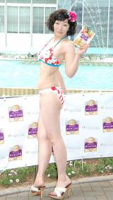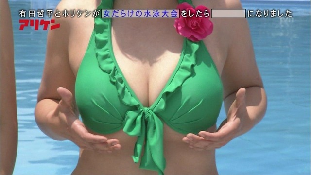 グリーンの水着は胸元でリボンを結ぶデザインのもの。果物のメロンぐらいありそうに見えますね!相方の白鳥久美子さんと比べてもその巨大さに圧倒されてしまいます♪