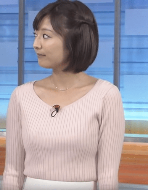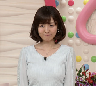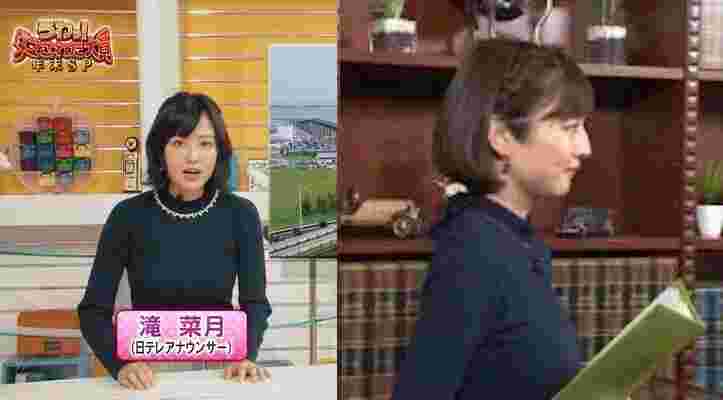 タイトな紫のセーターが滝菜月アナの美乳の形をくっきり浮かび上がらせていて、とてもセクシーな雰囲気です。
