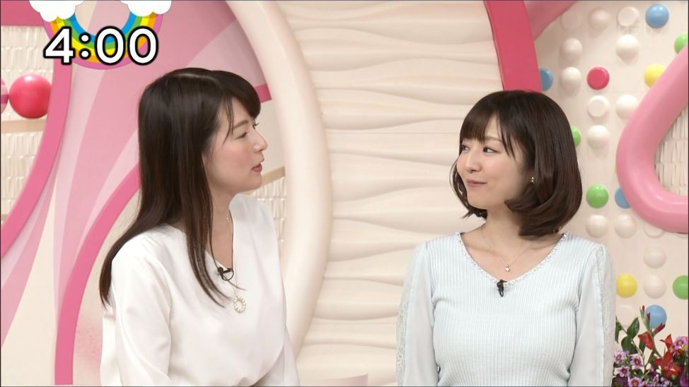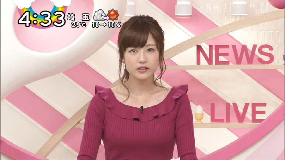 アイドル衣装のような可愛いフリル付きのトップスの滝菜月アナ。真剣にニュースを読んでいるのですが、大きなバストが気になってニュースに集中できません!