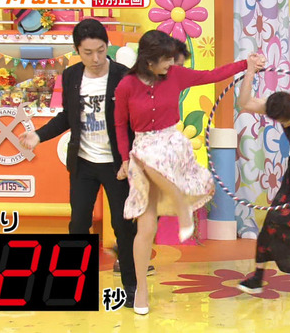 スカートの裾をひるがえし、大きな胸を揺らしながらフラフープを回している滝菜月アナ!露わになった太ももと、重そうに揺れる胸に思わず視線を注いでしまいますね!