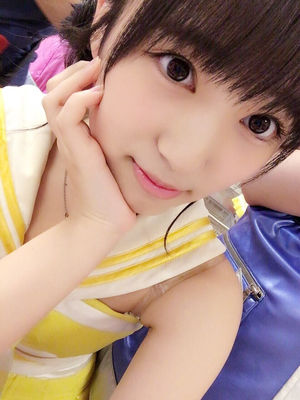 アイドル衣装を着たコチラの画像。至近距離から見ても肌がキレイでとても美人ですが、キャミソールの肩ヒモが下着のヒモのように見えて一瞬ドキッとする画像になっています!ちょっと得した気分になりますね♡