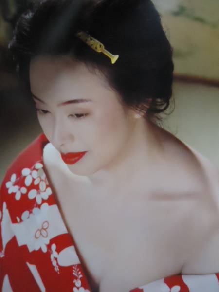 そして赤い口紅と赤い着物がとてもよく似合っています。少し微笑んでいるのも、魅力的です。