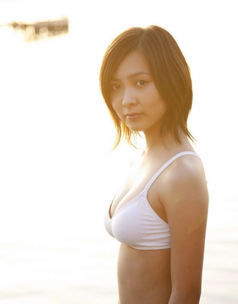 こちらは白いビキニを着た谷村美月さんですね。まるでスポーツ選手のように健康的に日焼けした肌がとてもキレイです。横から見ても大きな胸が盛り上がっているのがよく分かります。