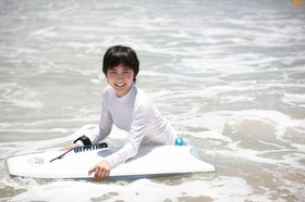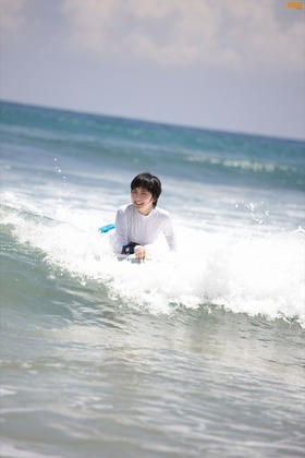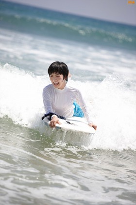 サーフボードに乗って笑顔を見せているとっても爽やかな谷村美月さん。白いラッシュガードと水色の水着が夏の海によく似合っています。
