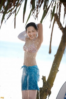ラッシュガードを脱ぐと美肌と美胸がお目見え♡ウエスト56センチという情報がありましたが、本当に細くてくびれが素晴らしいです♪
