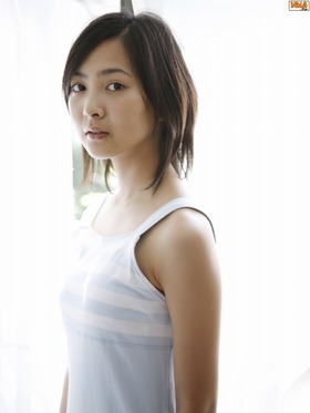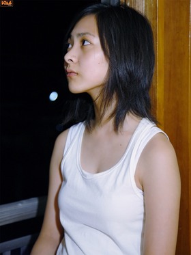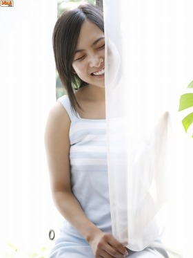 白と薄いブルーのストライプデザインのタンクトップ姿の谷村美月さんです。少しあどけない感じで、まだまだ少女のような雰囲気が残っていますね!