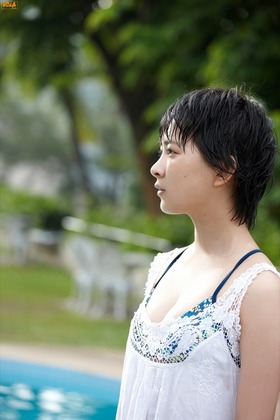 水着の上に可愛いキャミ―ソールを着た谷村美月さん。柔らかそうなDカップの巨乳の一部がチラリと見えています♡