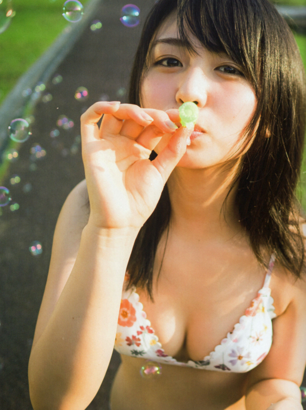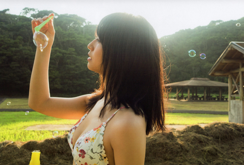 白地に花がプリントされた水着を着てシャボン玉で遊ぶ長濱ねるさん。無邪気な様子が子供みたいで胸キュンしてしまいますね!