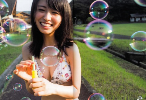 シャボン玉が七色に光って幻想的でキレイな写真です。こんな可愛い彼女がいたらきっと毎日が楽しくなりそうですね。