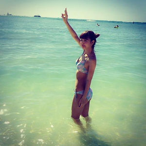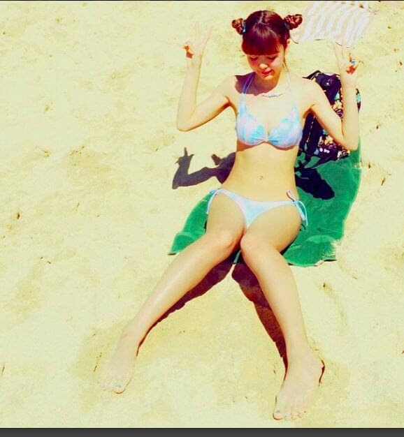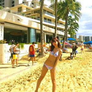 淡いパステルカラーの水着でオフの日を満喫しています。ウワサ通り細い肩にずっしり重そうな重量感のある胸が素晴らしいですね。髪を下ろしている時は少しだけお姉さんになったように見えます。