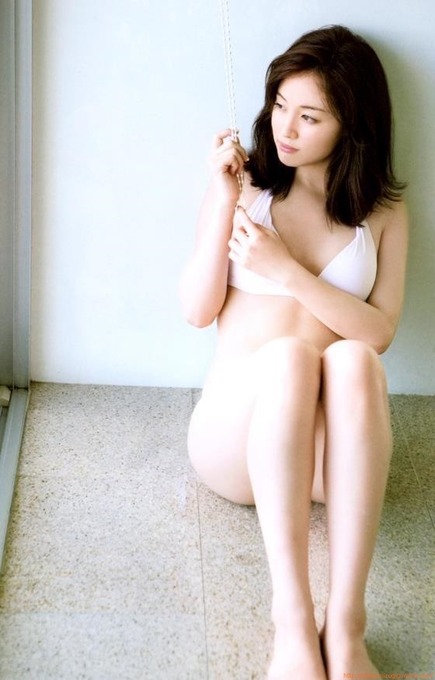 真っ白な清純水着を着ている新井恵理那さん。透明感溢れる美白肌に無垢な白さがよく似合います。