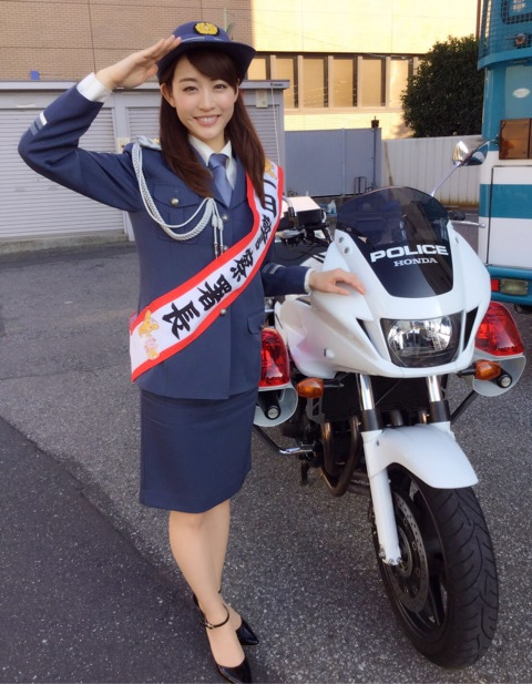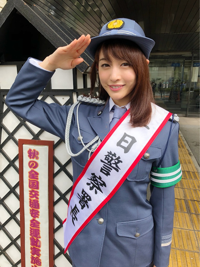 1日警察署長を務めた新井恵理那さん。婦人警官姿のあまりの可愛さに「逮捕されたい~!」という声が続出しました。