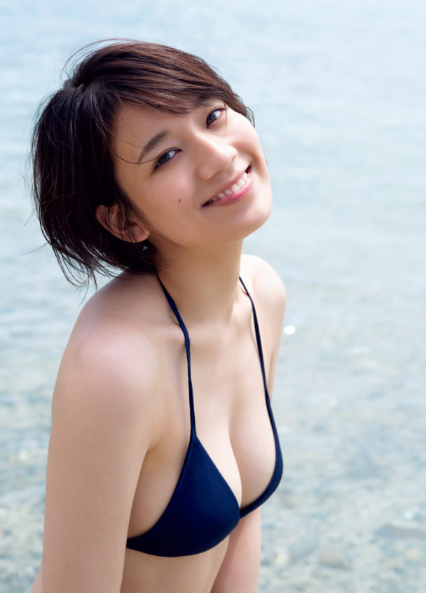 薄いいイエローカラーの水着で優雅に微笑んでいるショットの数々。大きく膨らんだ胸につい視線が向いてしまうのは仕方ありませんね♡