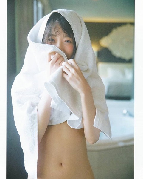バスタオルの隙間から可愛い笑顔と可愛いオヘソがのぞいています。ちょっとセミヌードにも見えるお宝ショットです♡