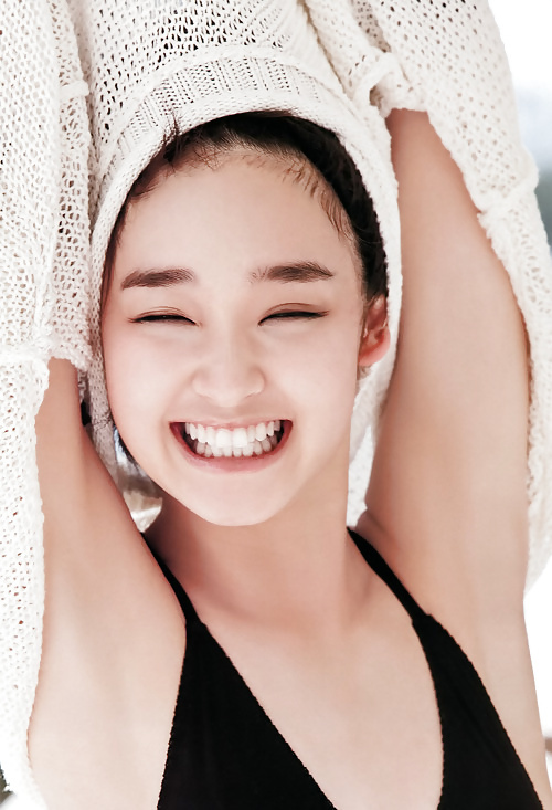 水着撮影が恥ずかしいのか照れたようにパーカーの袖で顔を隠しているショットも初々しくて良いですね♡