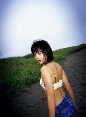 ビキニのブラにデニムパンツの堀北真希さんです。スッキリ綺麗な美ボディは今見ても完璧です。