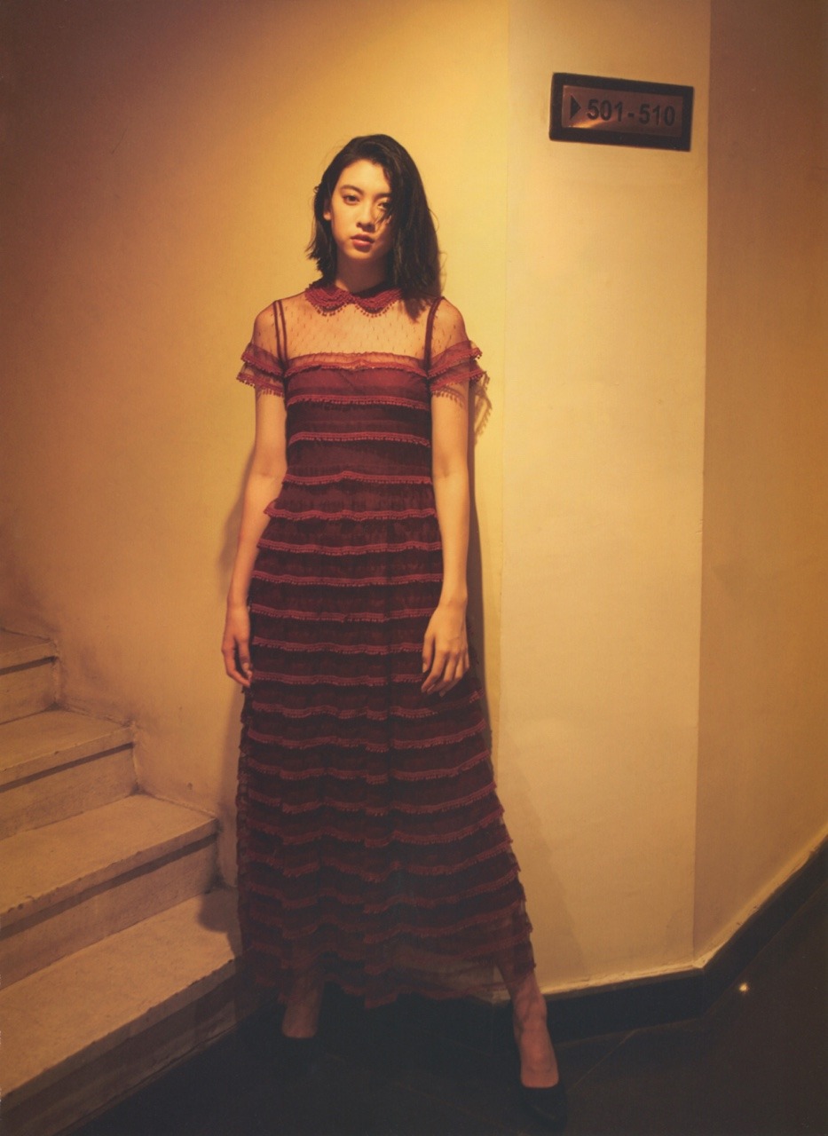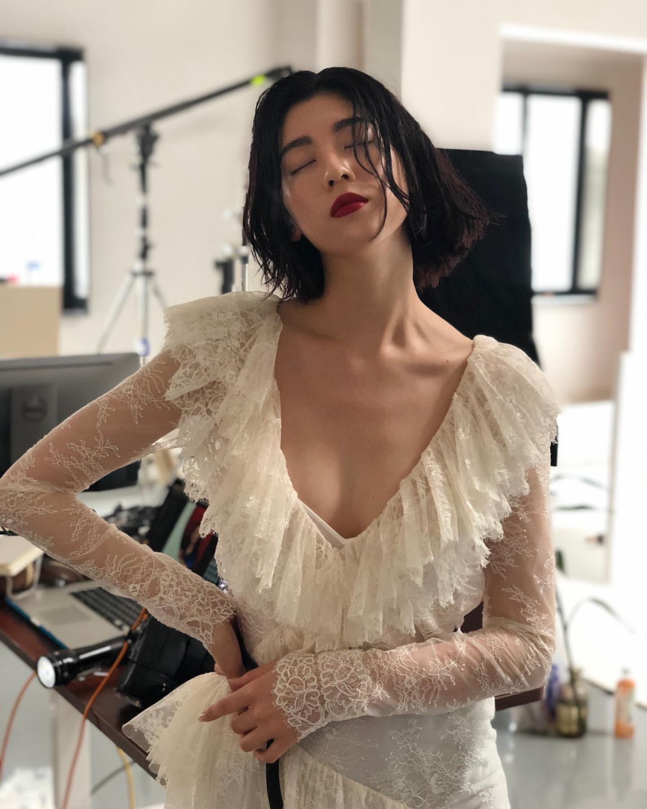 胸元がざっくり開いたドレス姿が艶やかです。このドレスを着こなすには難易度が高そうですが、ばっちり着こなしていてさすが売れっ子モデルですね。
