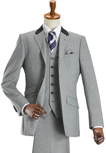 こちらのスーツは メンズスーツショップMARUTOMIの「段返り3ツボタンモッズスタイルスリーピーススーツ」。グレーの千鳥柄着用で、価格は二万円ほどするスーツです。
