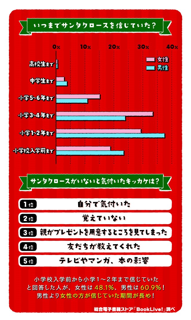 「いつまでサンタクロースを信じていたか」という質問に対して、女性は小学3~4年生まで、男性は小学1~2年生までと異なる結果になり、男性よりも女性の方がサンタクロースを信じていた期間が長いことがわかりました。
