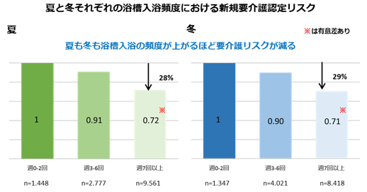 早坂信哉先生と千葉大の共同の研究において、1万4000人弱の高齢者を調査したところ、毎日湯船で入浴している人は3年後に要介護になるリスクが29%も低かったことがわかりました。