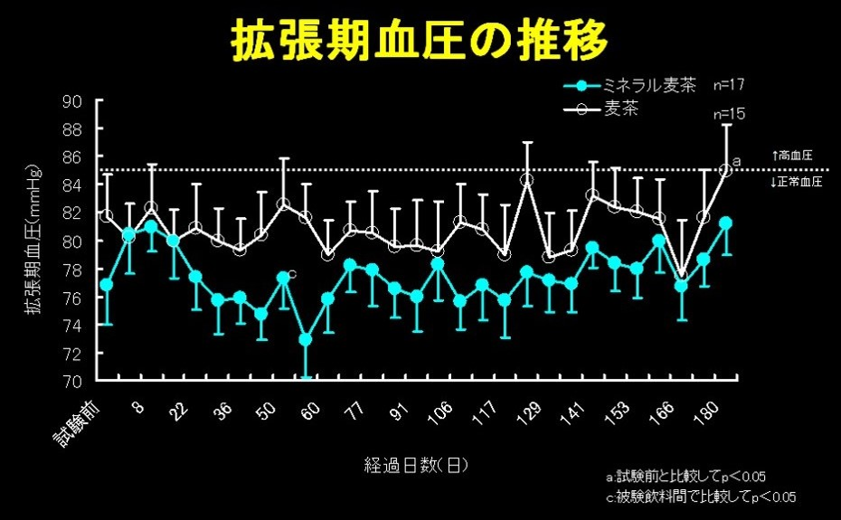 成人男女32名を被験者として、年齢、および収縮期血圧の平均がほぼ等しくなるよう、2つのグループに分けてミネラル入りとミネラル無しの麦茶各500mlを6ヶ月間(初夏~初冬)継続飲用させる実験がありました。