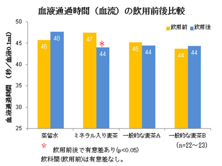 健常な男性22~23名にミネラル入りむぎ茶と2種類の一般的なむぎ茶を飲んだ後に、一定量の血液が流れる時間を測定すると、ミネラル入りむぎ茶が最も血液流動性が高い結果となりました。